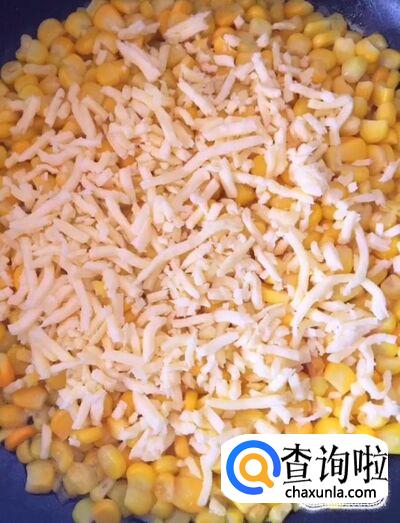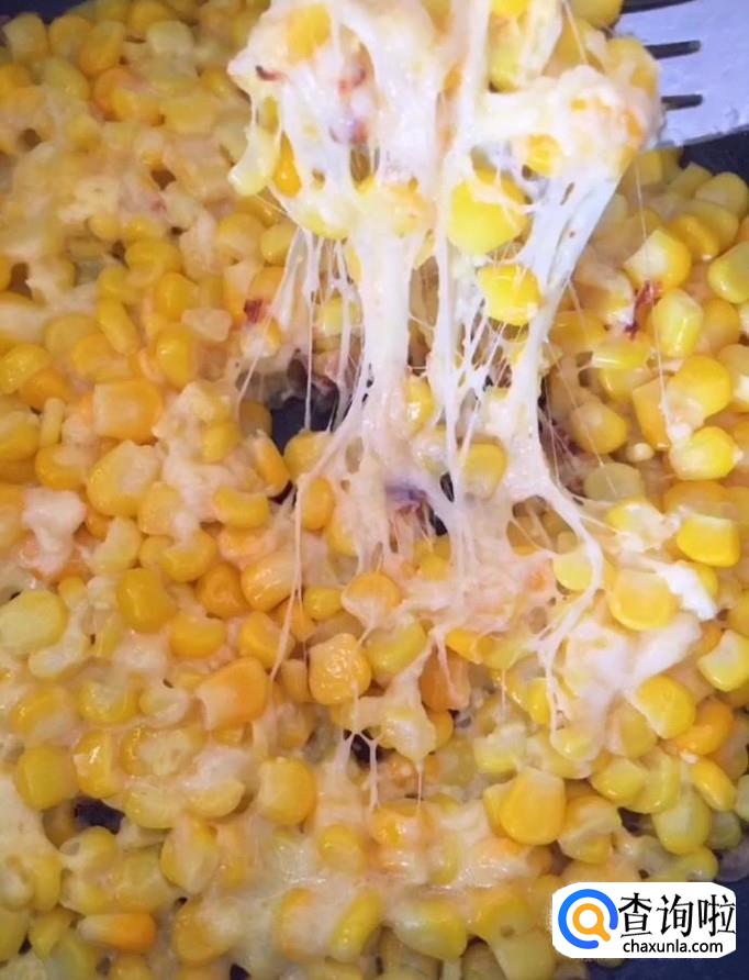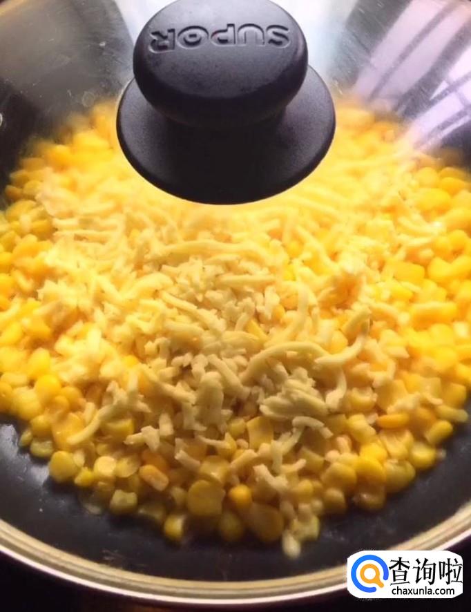 接着我们在平底锅中放入少许黄油,倒入搅拌好的玉米粒,摊平,撒上一些芝士,盖上锅盖,小火煎至定型并且芝士融化关火