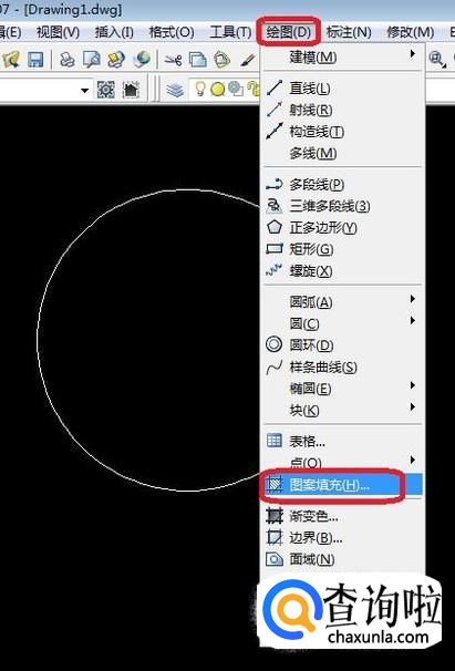 然后在页面中,根据要求画一个圆。画完之后,点击菜单栏“绘图”,下拉菜单中选择“图案填充”。