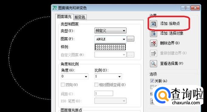 出现“图案填充”选项框,点击其中的“添加拾取点”,然后把圆选中(如图所示,选中之后圆变成虚线),点击确认后回到图案填充选项框。