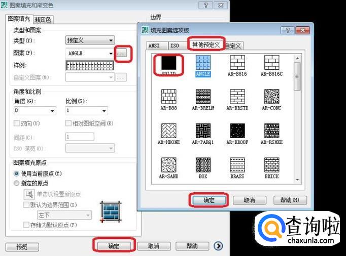 然后点击“图案”旁边的扩展按钮,弹出图案选项版,选择“其他预定义”下的“SOLID”图案,如图所示,点击确定。