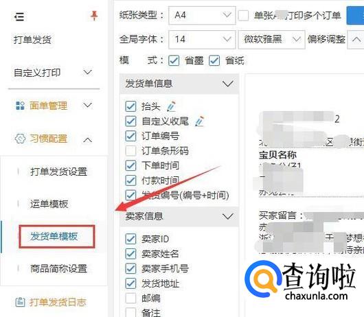 如下点击的是左侧的“发货单模板”选项卡,按照页面选择相应的多选框后进行下一步设置就可以了。