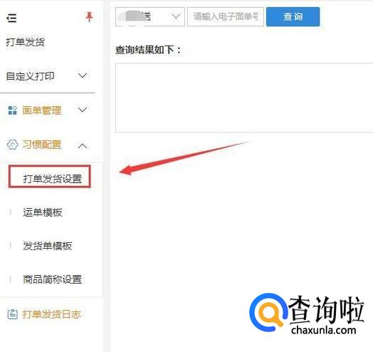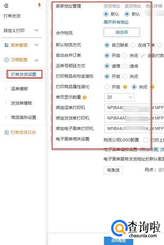 如下在左侧会看到有一个“打单发货设置”选项卡,点击它会在右侧打开相应的页面,按照页面提示进一步设置操作。