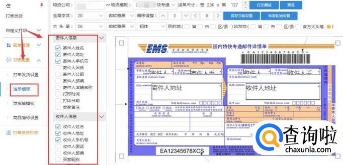 如下点击的是左侧的“运单模板”选项卡,可以参照右侧的页面图在左侧选择相应的多选框进行添加设置。