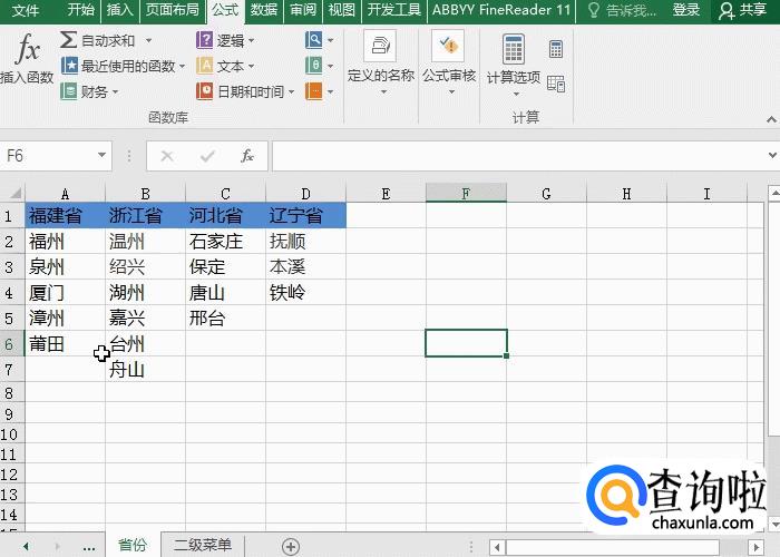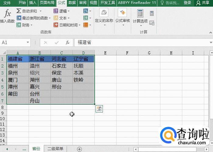 在【省份】工表中选中所有数据,点击【公式】-【定义的名称】-【根据所选内容创建】,在对话框中只勾选【首行】,其它选项全部取消勾选。