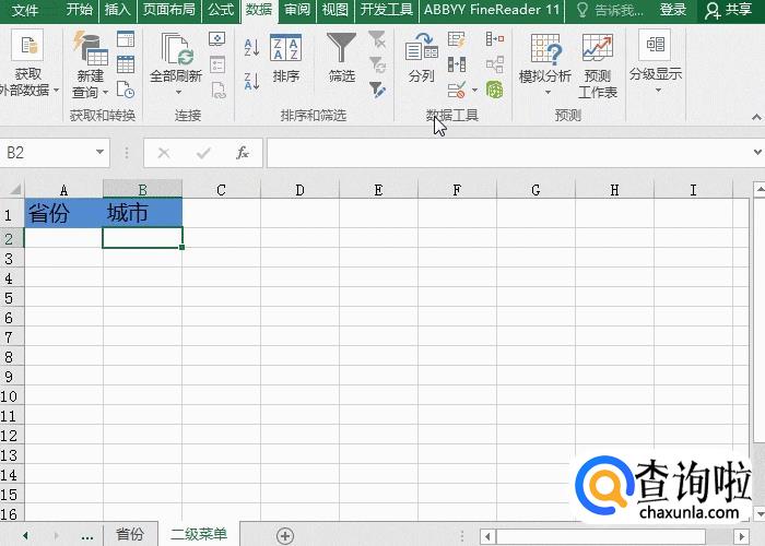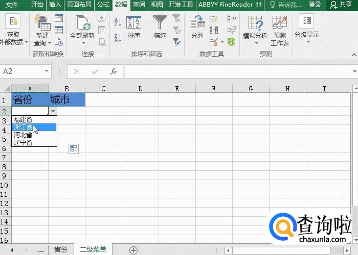 进入要设置下拉菜单的工作表中,选中【A2】单元格,进入【数据】-【数据工具】-【数据验证】,在允许中选择【序列】,在来源中进入【省份】工作表,选择首行的内容,并点击确定。这时候A2单元格表中就有下拉菜单了。