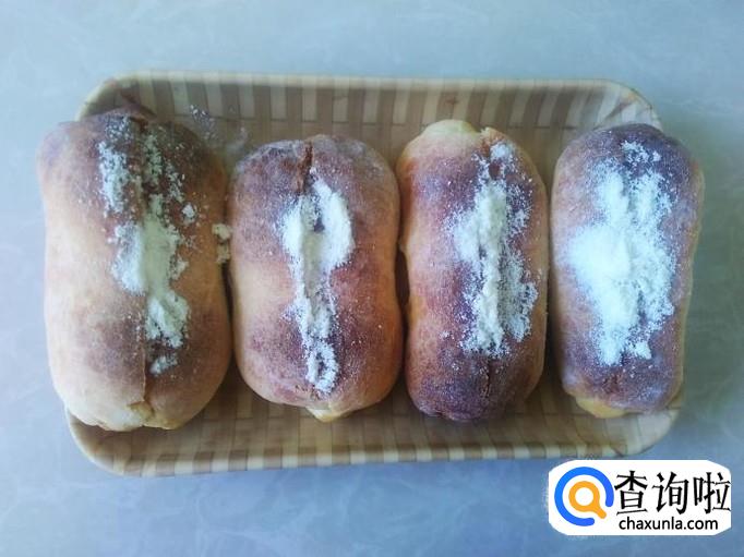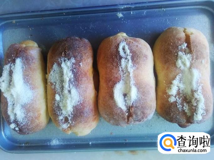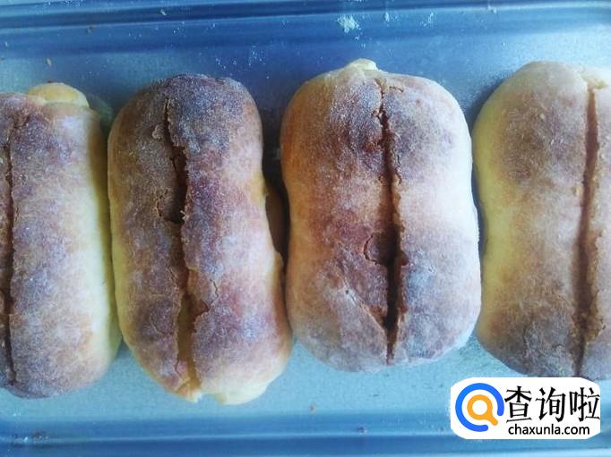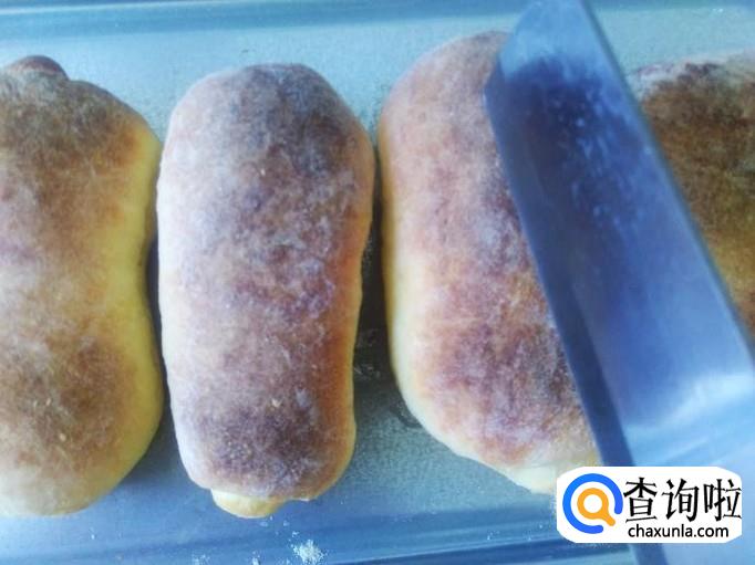 把烤好的面包拿出来,用刀在面包中间切一刀缝。