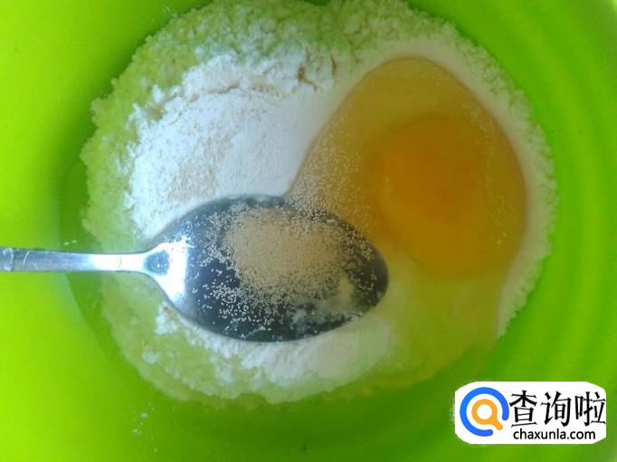 把面粉放到盘子里,加酵母【按说明下料】,打1个鸡蛋进去。