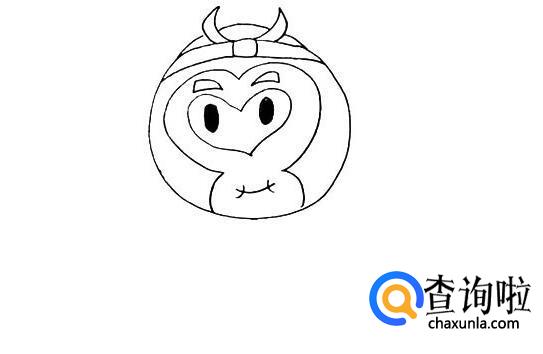 再画出他粗粗的眉毛、椭圆形的眼睛和紧闭起来的嘴巴。
