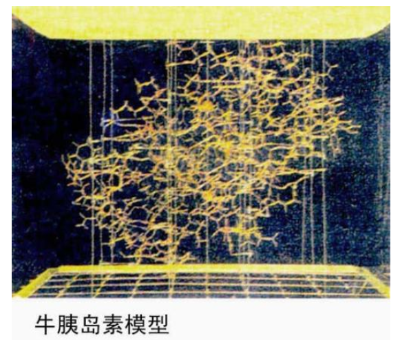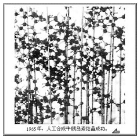 1965年我国首次合成牛胰岛素。1965年,中科院有机所和北京大学化学系合作,由汪猷和邢其毅领导的联合研究小组完成了胰岛素A链的化学合成,上海生化所化学合成的胰岛素B链进行重组取得成功,并纯化得到了具有与天然胰岛素完全相同的比活性和抗原性的人工合成牛胰岛素结晶,且其结晶形状和酶切图谱也与天然物相同。
