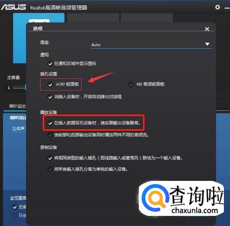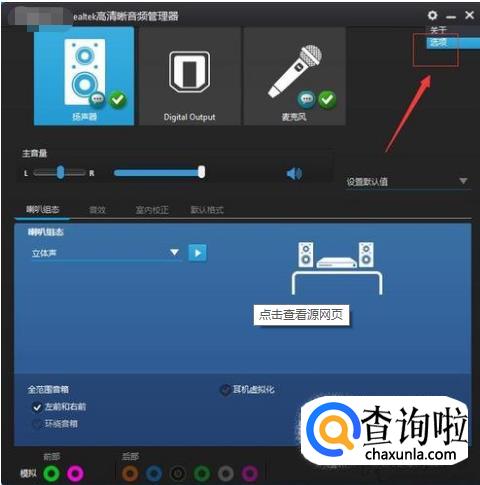 打开的Realtek高清晰音频管理器,点击【选项】。