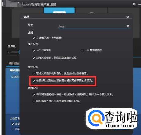 使前部和后部输出设备同时播放两种不同的音频流,再点击:“确定”。