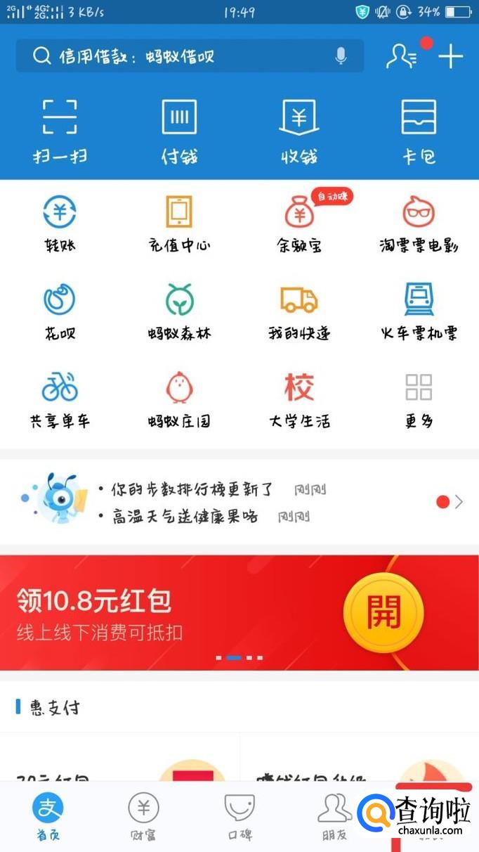 进入支付宝后,点击首页顶部的“我的”,进入个人中心。