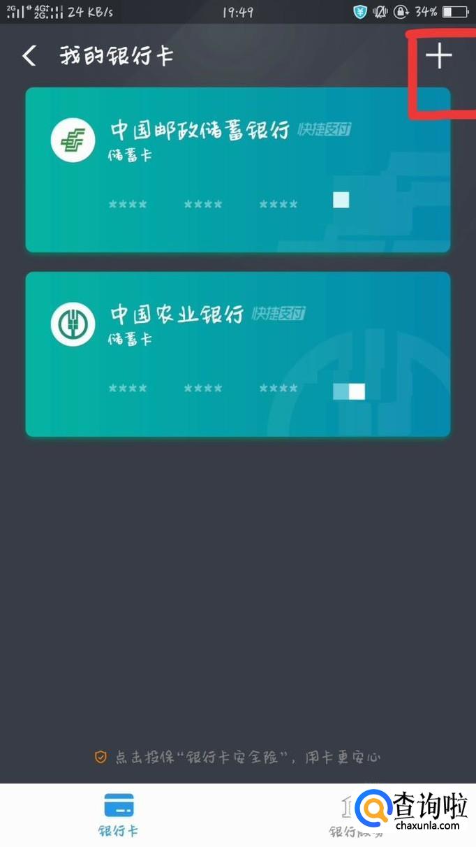 进入银行卡后,点击右上角的加号,即可添加新的银行卡。