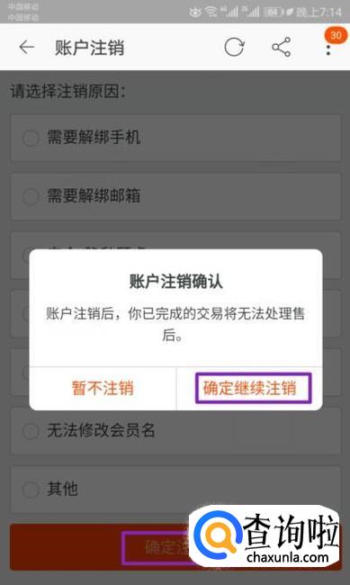 然后我们点击确定继续注销,之后选择原因,然后点击确定注销就可以注销了。还是比较简单的,相信大家现在都会了。