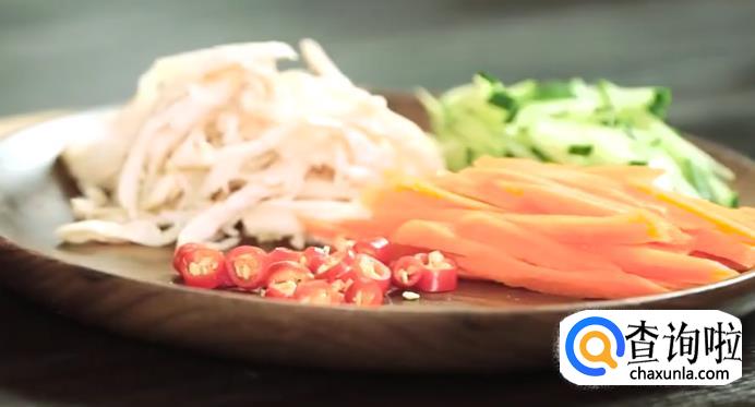 之后把黄瓜、胡萝卜切丝,小米辣切碎备用。