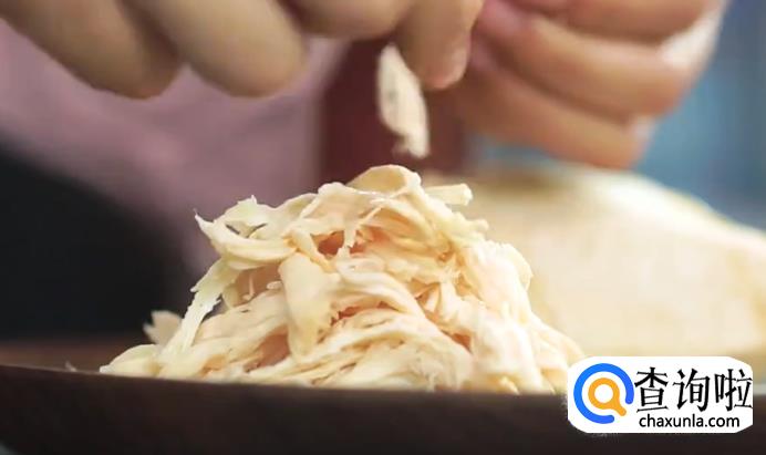 接着把鸡胸肉盛出放凉,将鸡胸肉撕成丝状。