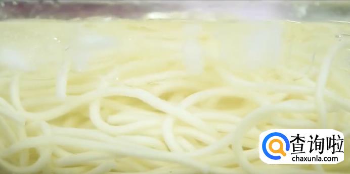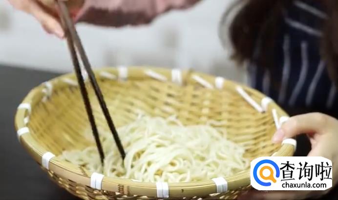 首先在锅中把水煮沸,之后下入面条,接着将面条浸入冰水之中。