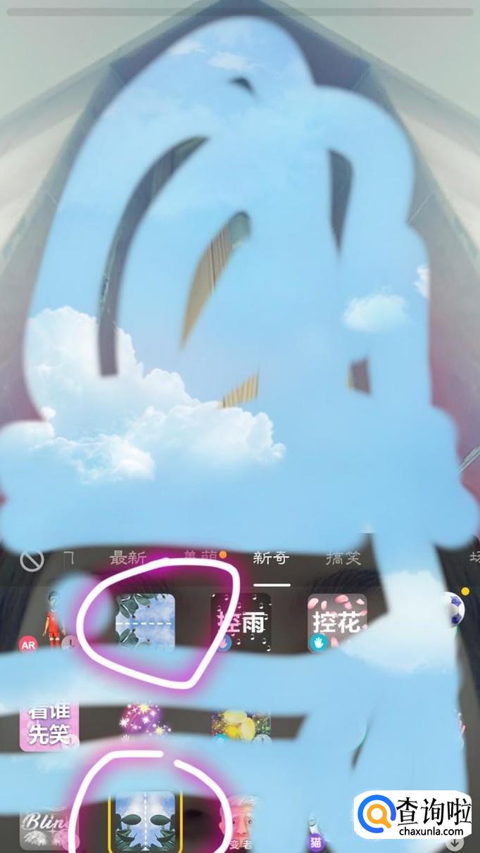 最后,大家就可以看到很多道具,里面有各种各样的道具,我们都可以用,我们要用的双胞胎特效,可以在“新奇”的道具专区里找到,我们点击以后便可以使用双胞胎特效来录制自己的作品