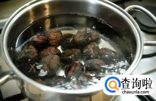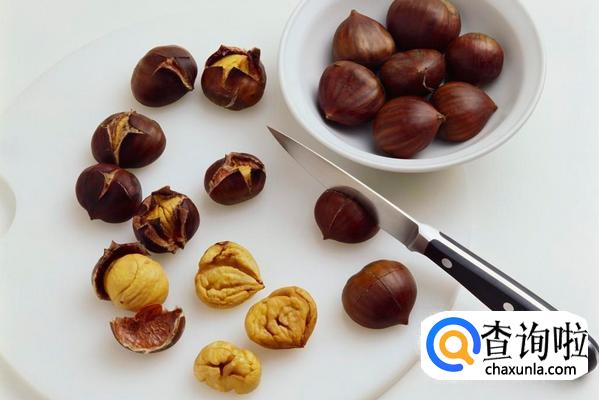 生栗子洗干净后放入一个碗中,加少许盐,然后用开水将栗子泡一会。几分钟后,把栗子拿出切成两半,栗子皮会自己脱落。