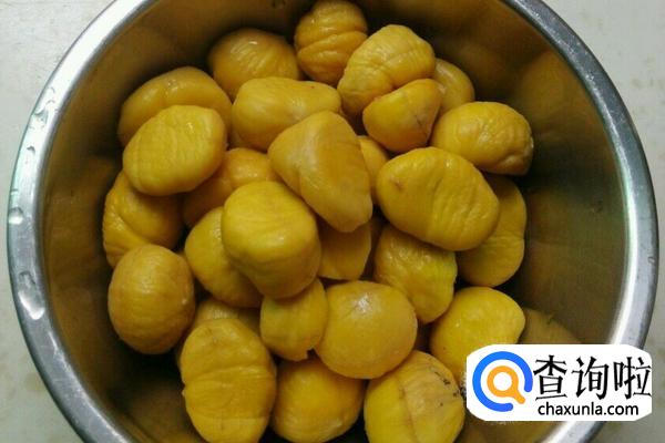 先将栗子的外壳剥除,然后放入沸水中煮5分钟,捞出后马上放入冷水中浸泡5分钟,这样就很容易去掉栗子皮。