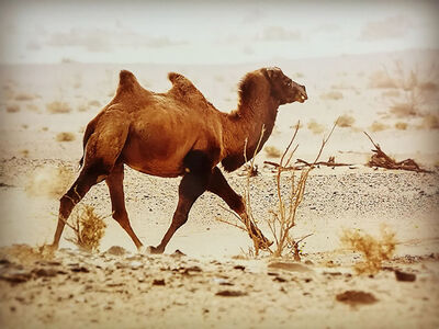 野骆驼(学名:Camelus ferus)巨大的有蹄类动物,头体长3.2~3.5米;肩高1.6~1.8米;体重450~680公斤。背上有两个驼峰。头小,颈长而且向上弯曲,体色金黄色到深褐色,以大腿部(股部)为最深。在冬季颈部和驼峰丛生长毛,有双行长长的眼睫毛和耳内毛抵抗沙尘,而缝隙状的鼻孔在发生沙尘暴时能够关闭。野生驼比家养的体型较小而轻捷,它的驼峰显著地小且更接近圆锥形,毛被也较薄。原产地是中国、蒙古。区域性灭绝:哈萨克斯坦。分布地从新疆东南塔克拉玛干荒漠、青海西北部、甘肃西北部进入内蒙古戈壁荒漠;伸入蒙古和中亚。