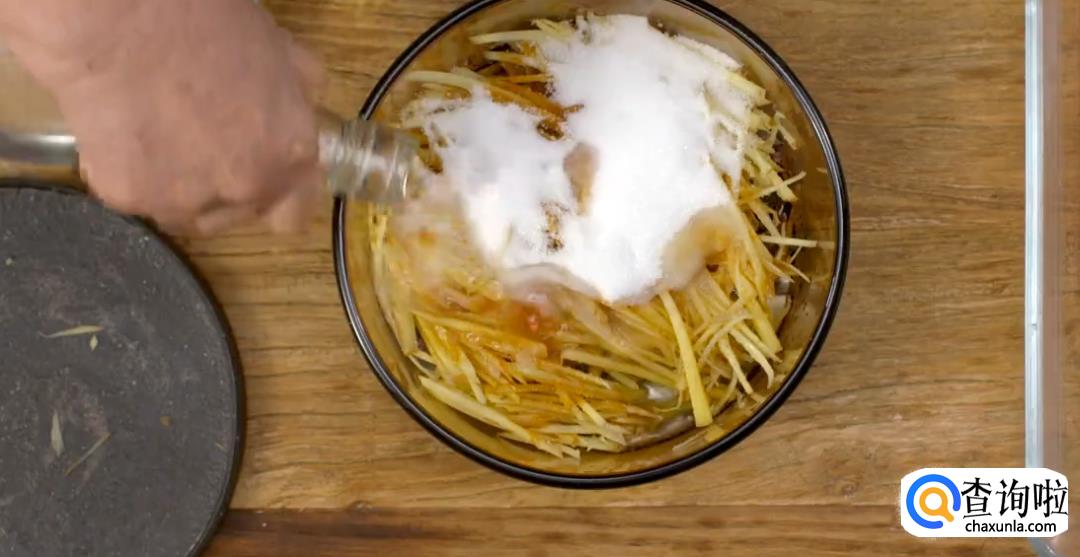 准备一块老姜,洗净切丝。将鱼肉取出放入锅中,鱼身上铺上姜丝。