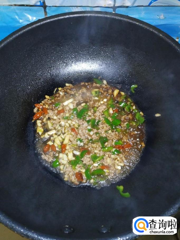 炒锅中放入适量油,油热后将猪肉末倒入锅中炒香,然后将准备好的蒜末和青椒粒倒入锅中,翻炒均匀。