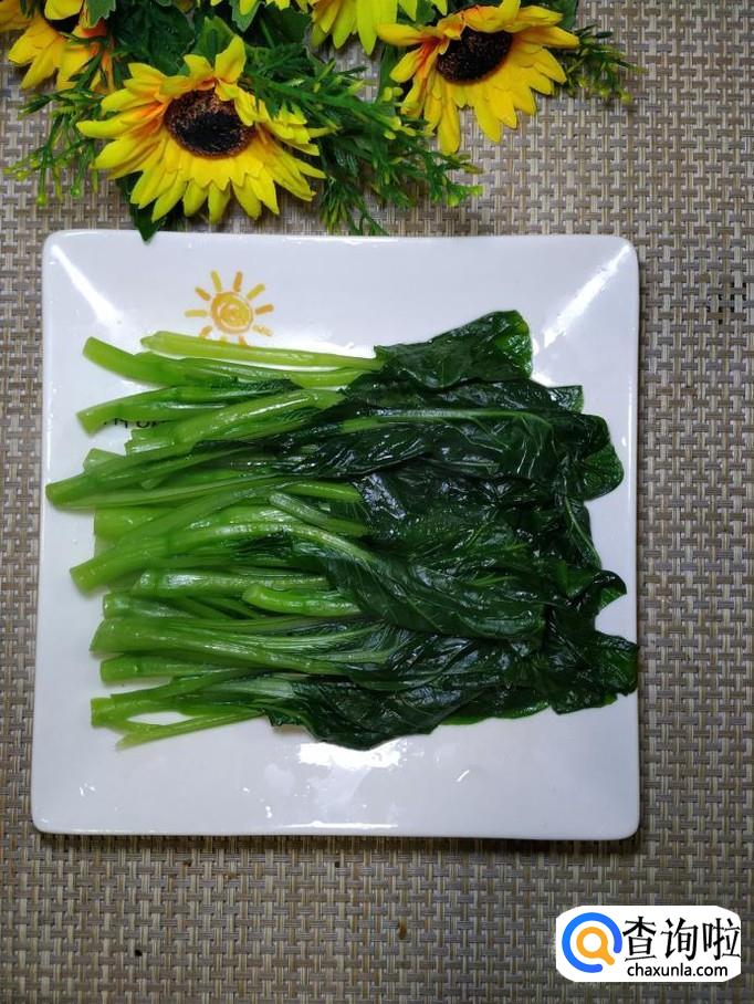 锅中烧开水,水开后,将广东菜心放入锅中焯水,可以加入适量食盐和油,这样可以保持菜心的碧绿色泽。焯好之后,将菜心儿均匀的摆在盘中。