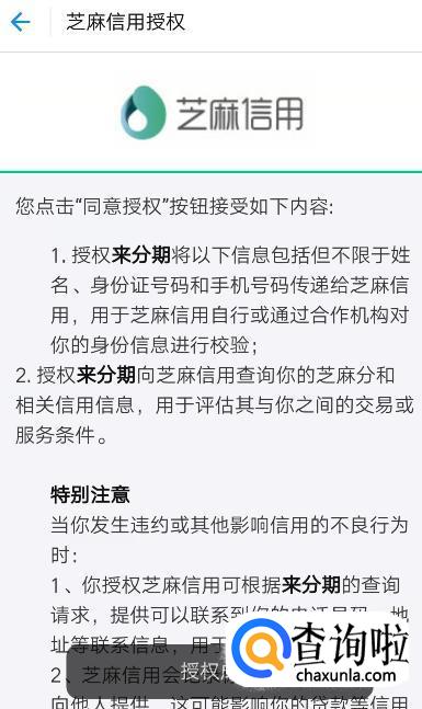 随后进行芝麻信用授权页面,阅读相关约定后,点击授权等待授权成功。