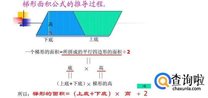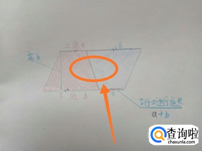 然后其中一个梯形面积的则是平行四边形的一半,所以要除以2,即梯形面积公式为:(a+b)x h÷2