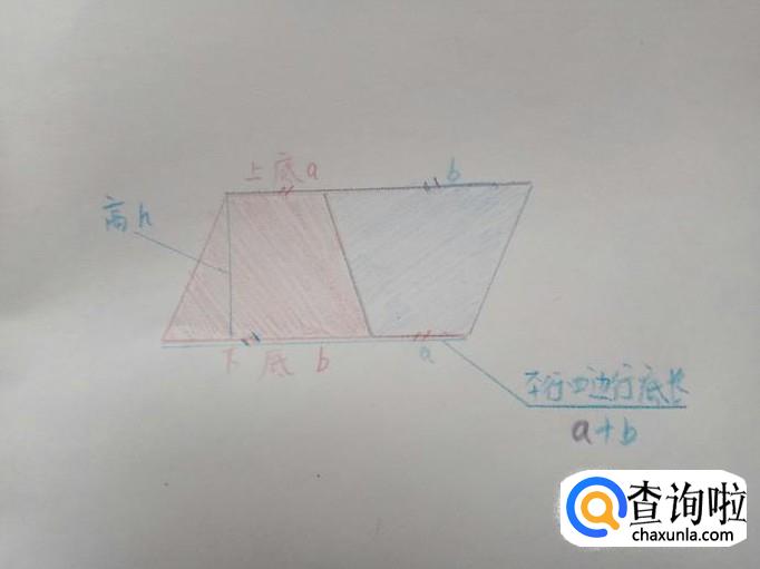 用平行四边形推导梯形面积的方法:先将两个相等的梯形拼成一个平行四边形,如下图所示。设梯形上底长为a,下底长为 b;