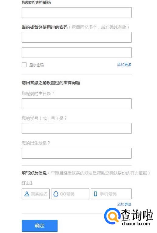 然后我们需要提供一些资料,例如你的名字、身份证号码、以前用过的密码和密保等等的问题,填写好就点击确定提交。