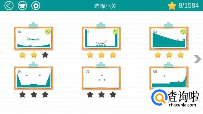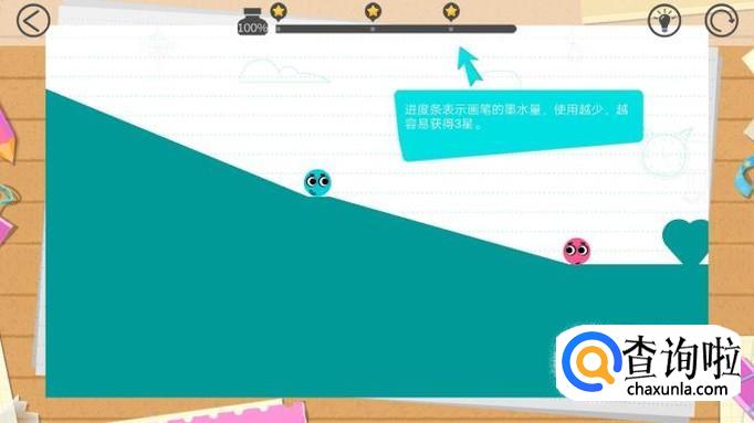 游戏分为好多关卡,点击一个关卡进入游戏,通过画线让两个小球碰到一起就算过关。注意:使用墨水越少,也就是画的线越少,星级越多,满星过关为三星!
