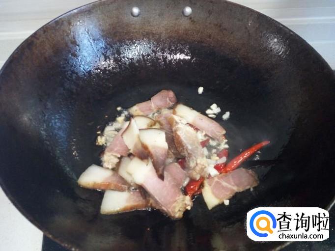 随即放入腊肉翻炒,放入少许料酒,酱油。