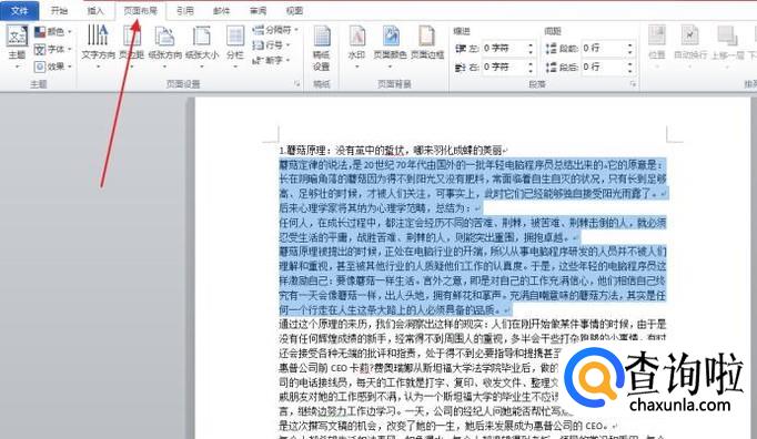 然后选中你想要设置分栏的内容,并点击顶部的页面布局,如图。