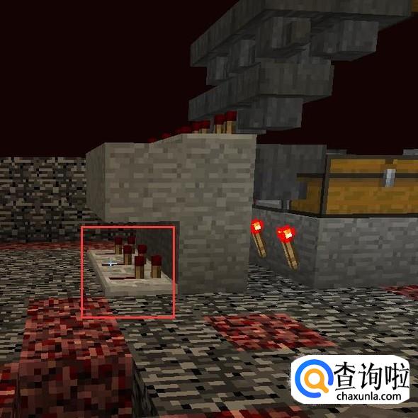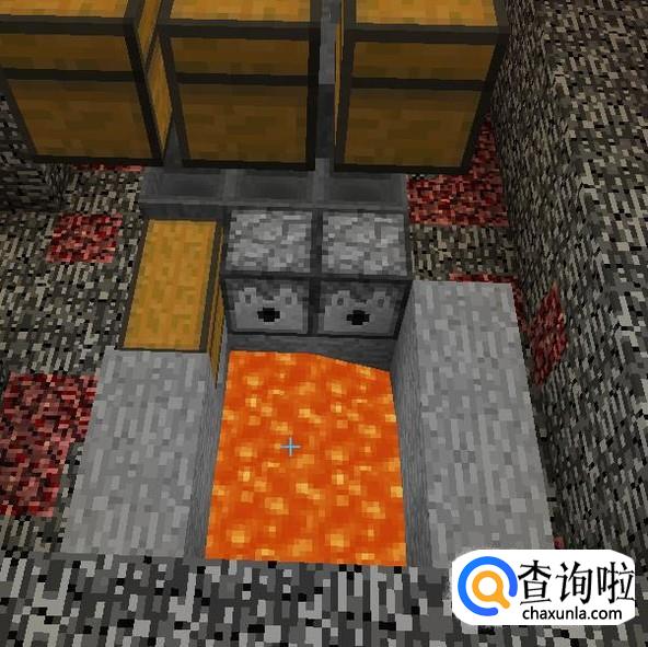 用石头将发射器的前方挡住,并且挖一个2X3的区域,倒入岩浆。