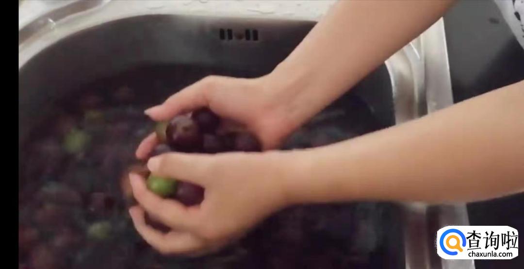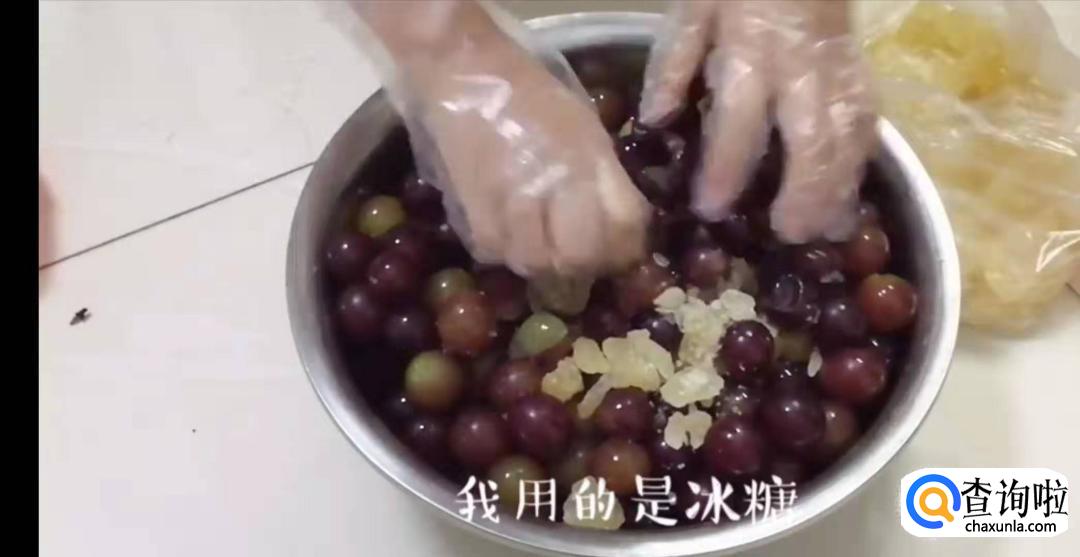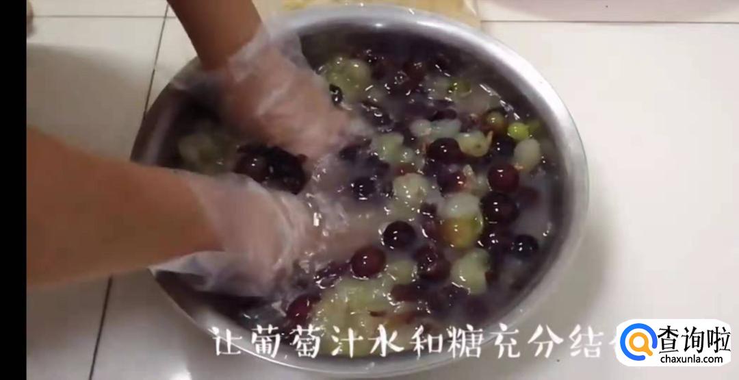 把葡萄倒在盆里,用手把它们一个个捏碎,葡萄皮,葡萄籽和果肉全都留在盆里,让葡萄汁水和糖水充分结合。