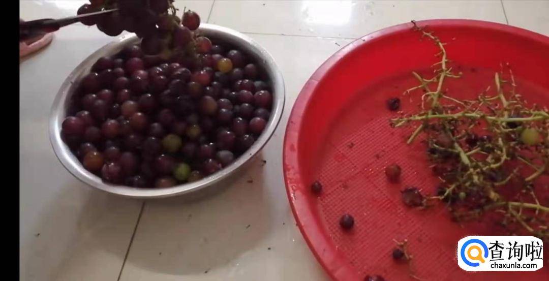 买回来的葡萄先从根部剪下来,剪刀贴近果蒂,把葡萄挨个地剪下来,可以留一点果蒂,以免伤了果皮;不要直接用手摘,因为后面需要用盐水浸泡葡萄,防止葡萄有农药残留,如果是没有果蒂的葡萄,盐水会直接进入葡萄内,影响以后葡萄酒的口感