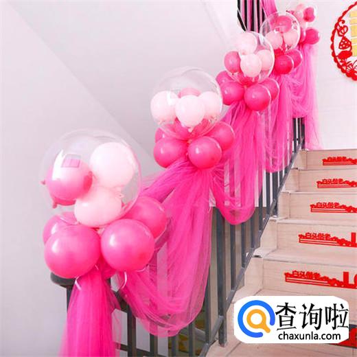 将准备做成气球过道的位置用绳子拉出来,然后将五颜六色的气球吹起,全部挂在绳子上,一个气球过道就做好了,或者直接绑在楼梯上,效果也非常好。