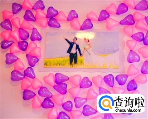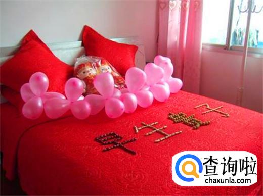 将气球吹起然后随意放在婚床上,一般选择紫色或者是粉红色,并且搭配上一些鲜花或者花瓣,非常的浪漫温馨。