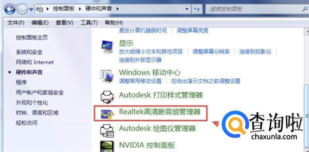 这时要找到硬件与声音面板下方的“Realtek高清晰音频管理器”,并点击进入。