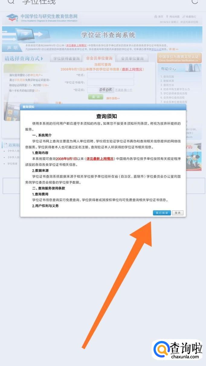 阅读完查询须知后,点击“我已阅读”。