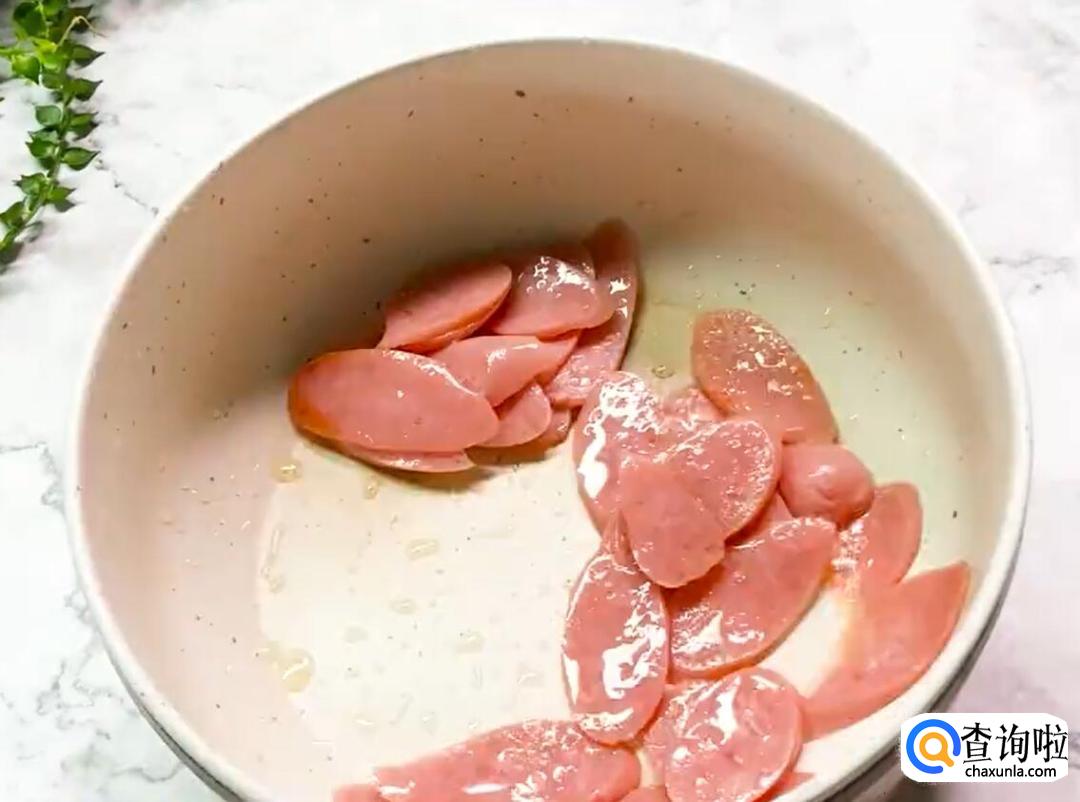 热油,倒入火腿肠翻炒。