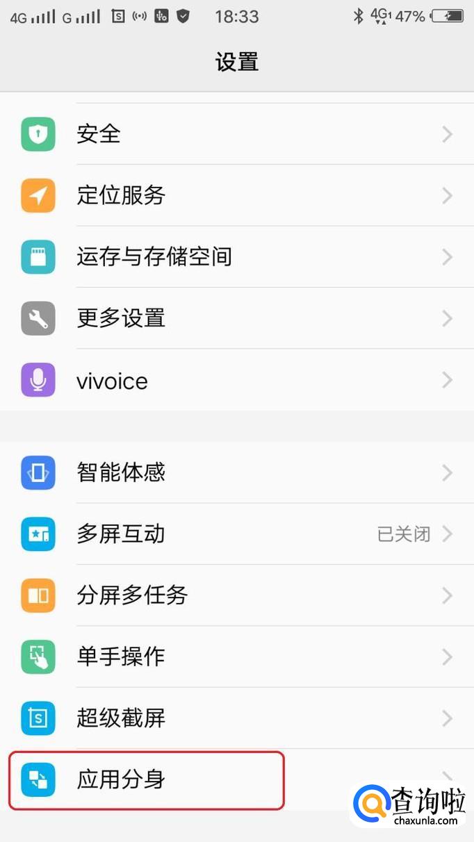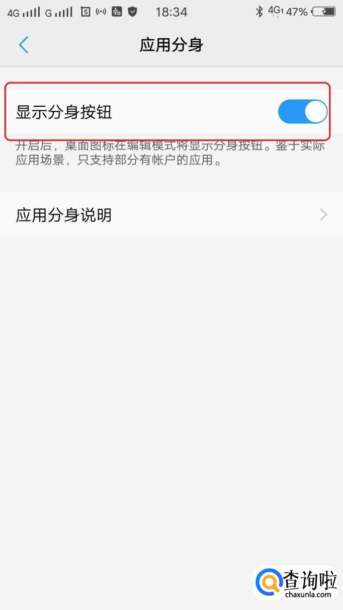 然后,在设置中找到“应用分身”,点击一下进入,打开“显示应用分身”按钮。