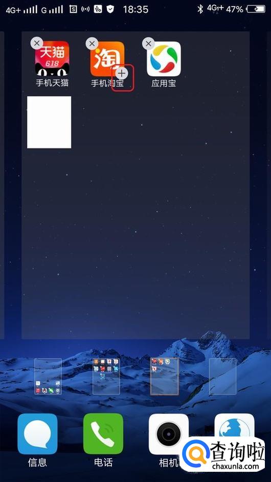 此时,我们回到手机桌面,如图所示,长按淘宝app图标,就会看到图标右下角出现了一个“+”号,我们点击一下。