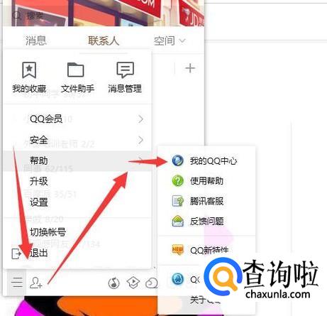 然后点击qq端左下角的主菜单,点击帮助菜单下的“我的qq中心”