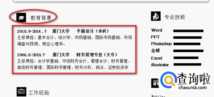 接着再写上教育背景,比如XXX年就读于XX大学,XX专业(学历),学了哪些专业课等等。