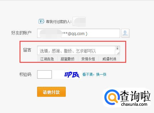 输入账户名之后可以给好友留言,表示感谢,然后输入验证码,点击“请他付款”。