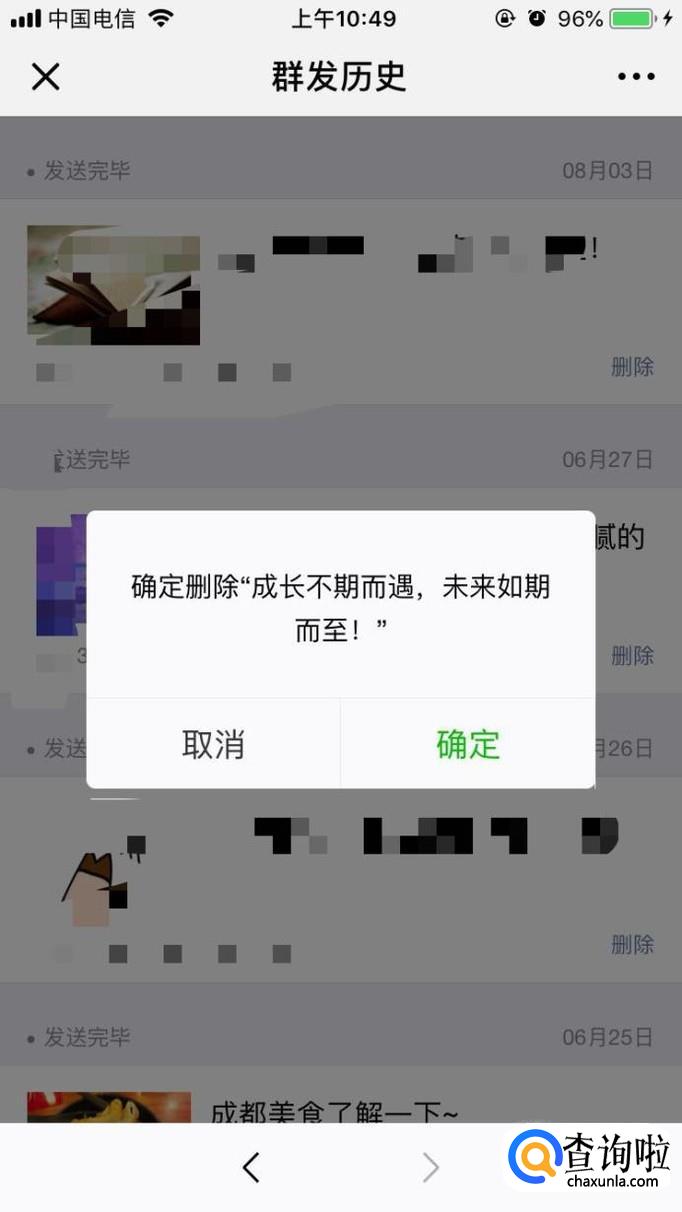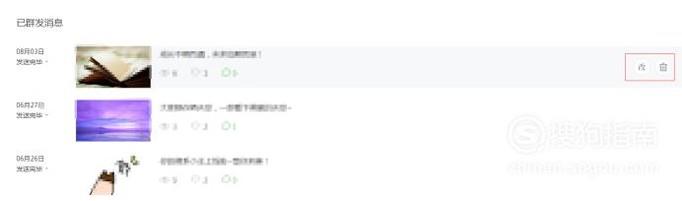 接着在直接进入的界面上就可以看到自己已经群发的历史消息,将鼠标移到要删除的消息上面,就可以在右边看到修改和删除消息的图标。