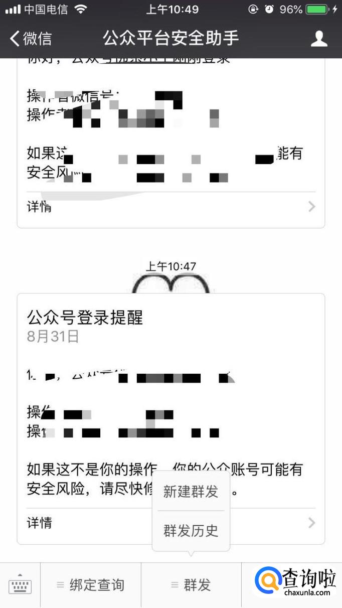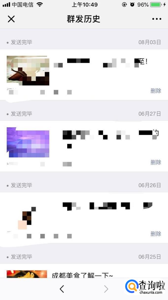在手机微信上搜索“微信公众号助手”进入管理界面。点击群发——历史群发进入界面。